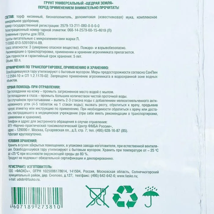 Грунт универсальный Щедрая земля, 60 л — Характеристики