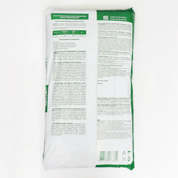 Содержание доступных для растений питательных элементов и pH: Азот мл/кг -150, Фосфор мл/кг - 150, Калий мл/кг - 150, pH:6-7.