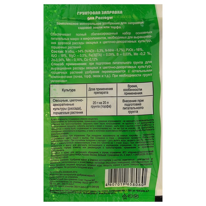Комплексное минеральное удобрение для заправки садовой земли или торфа. Обеспечивает полный сбалансированный набор основных макро- и микроэлементов, необходимых для выращивания овощных и цветочно-декоративных культур, горшечных растений.