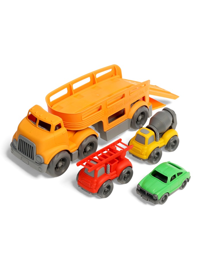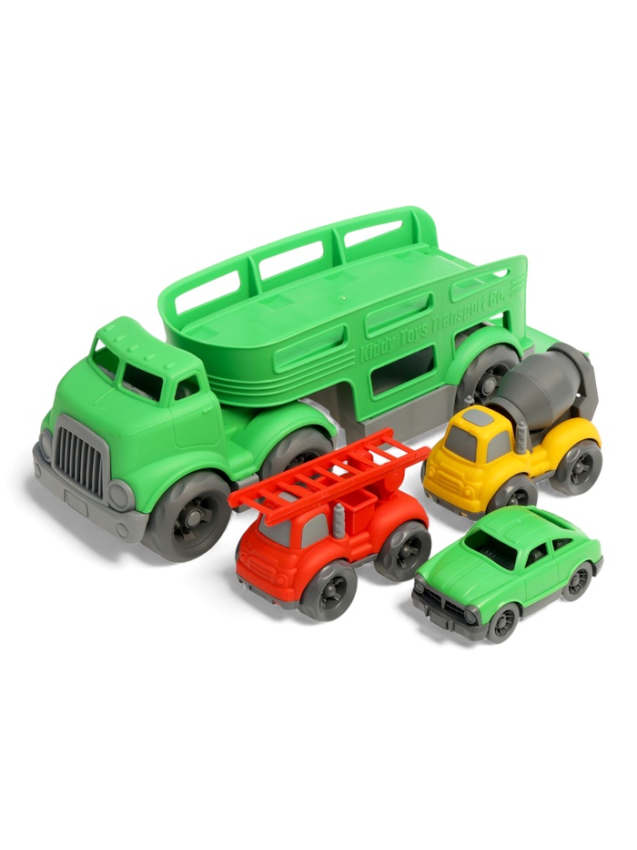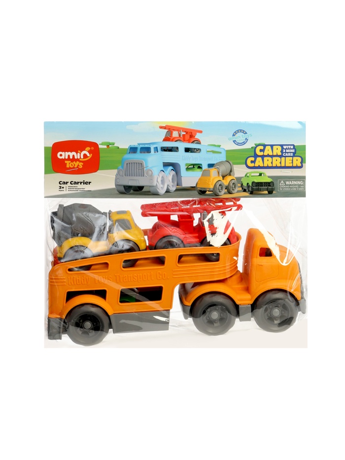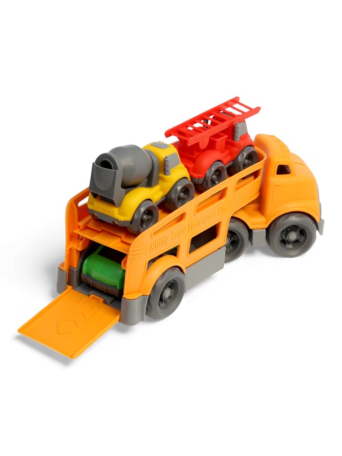 Организуй перевозку спецтехники! Детский автовоз с тремя машинками — это игровой набор из четырёх транспортных средств. Ребёнок загружает пожарную машину, бетономешалку и легковую машинку на платформу автовоза и создает тематические сценарии.