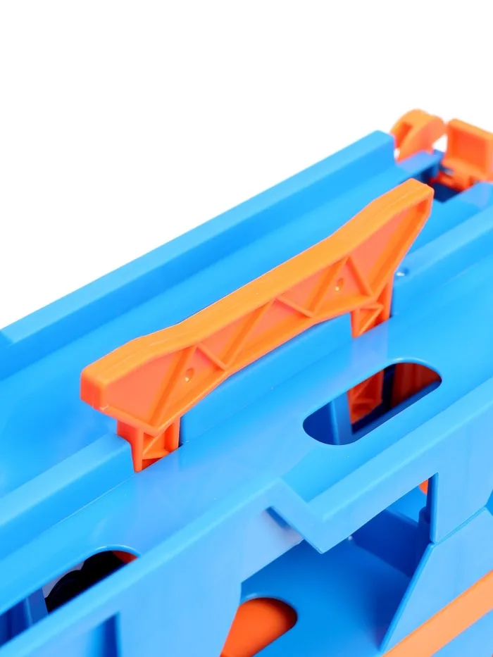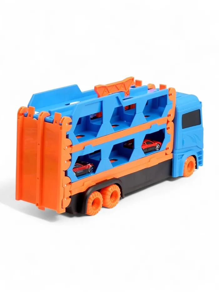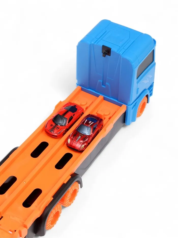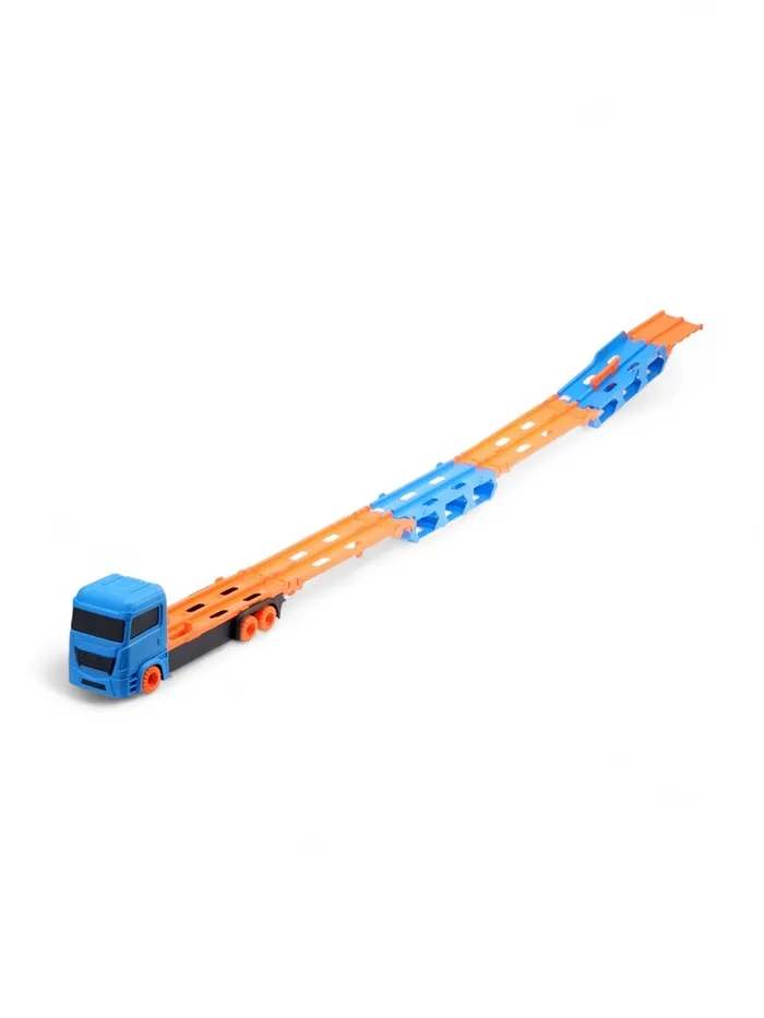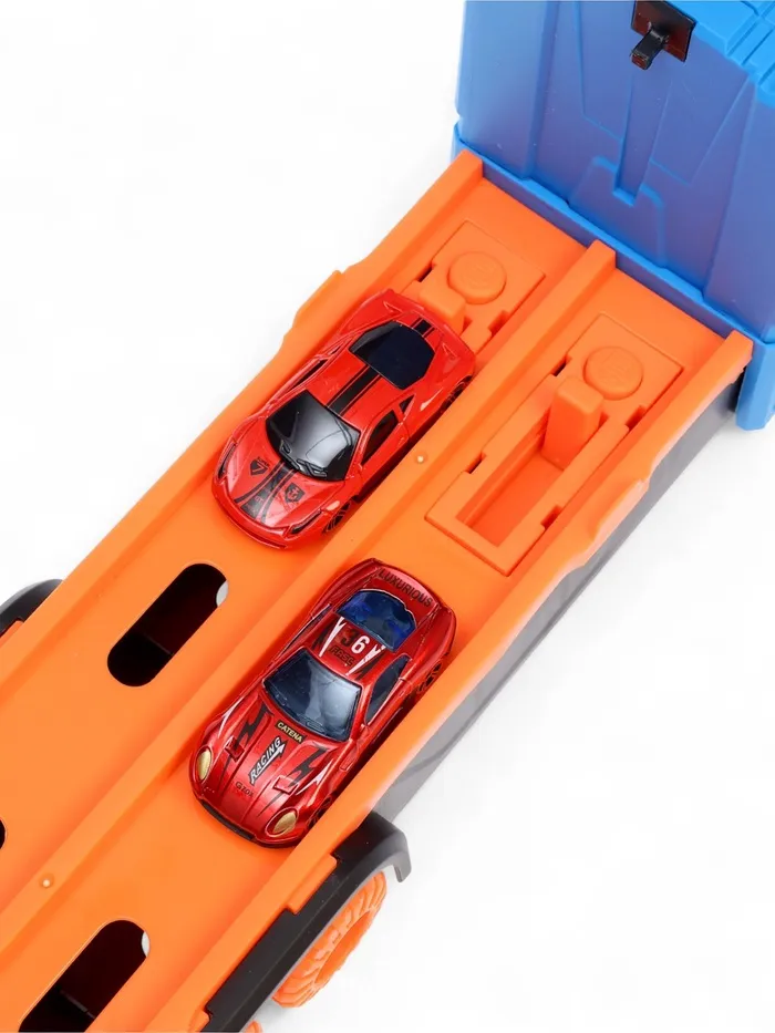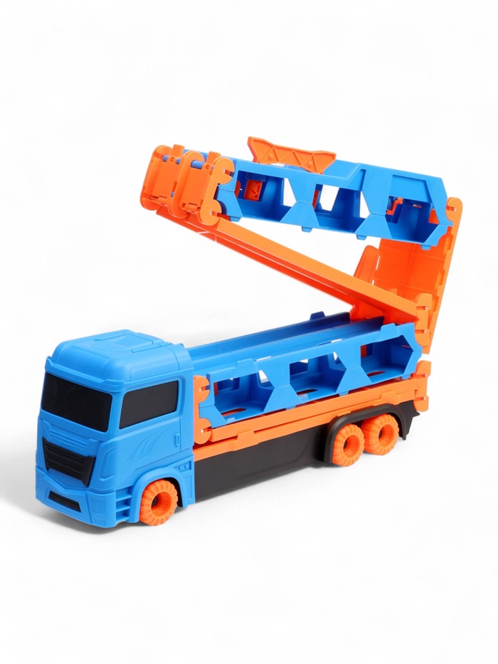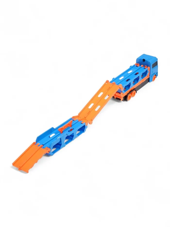 - Трансформер «автовоз — трек»: грузовик раскладывается в трек. Удобная ручка позволяет брать набор с собой — игра продолжается в гостях или на улице.