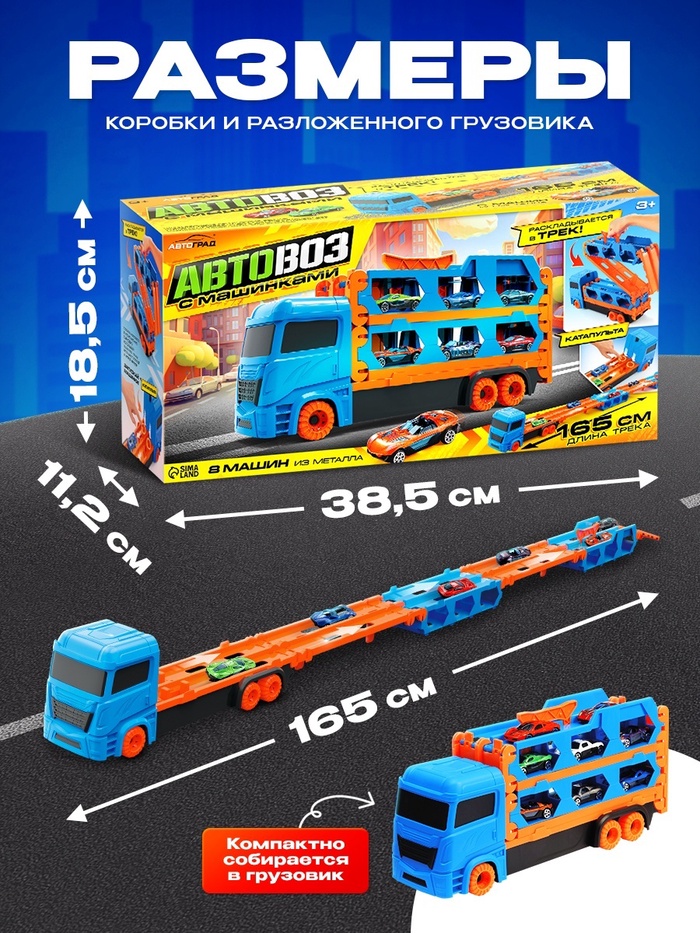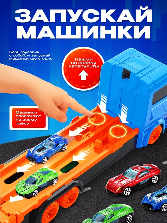 Создай гоночный трек и запускай машинки с разгона! Гоночный автовоз с треком и машинками — это игровой набор для скоростных заездов и динамичных сюжетов. Шесть металлических машинок, трек длиной 165 см и пусковая катапульта — всё, что нужно для захватывающих гонок.