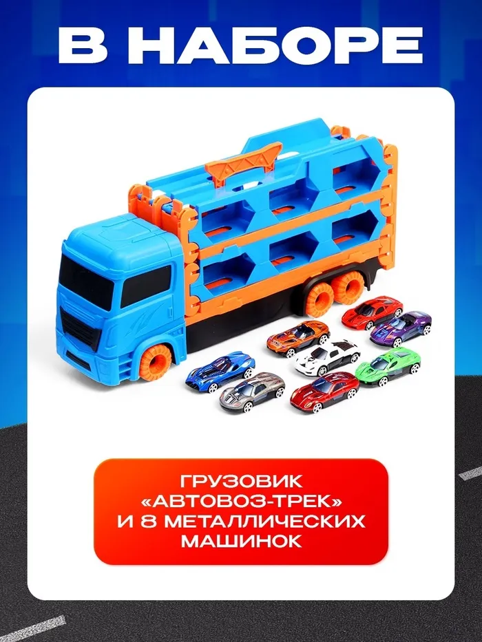 Грузовик «Автовоз-трек», с катапультой, набор металлических машинок 8 шт. — Характеристики