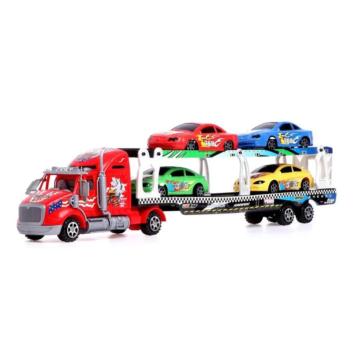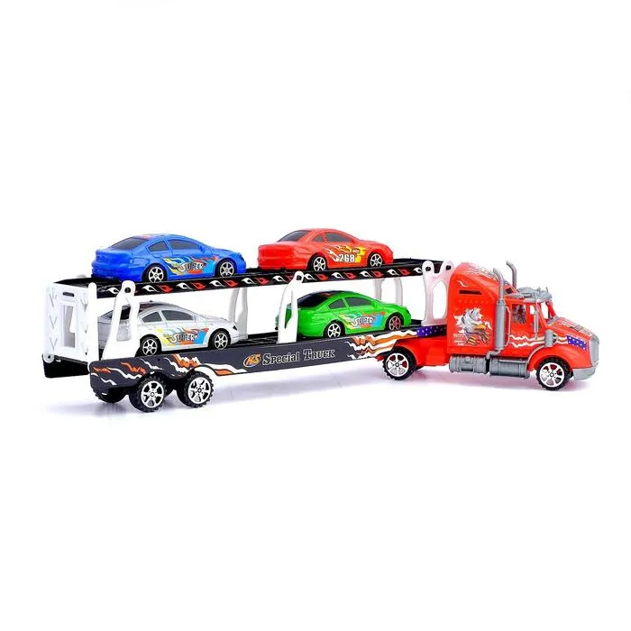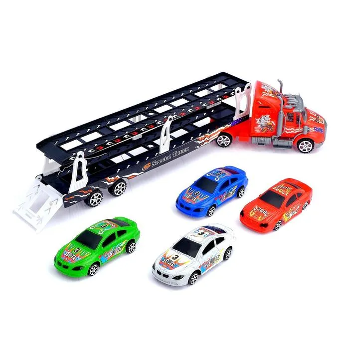 - Набор в комплекте: в набор входят несколько машинок, которые можно загружать на платформу автовоза. Теперь ребёнок сможет не только устраивать гонки, но и перевозить технику, создавая свои собственные сюжеты.