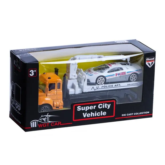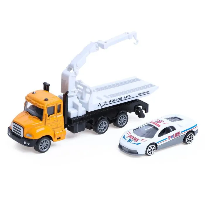 - Набор из двух машин: в комплект входит металлический эвакуатор и легковая машинка, которую можно перевозить на подвижной платформе. Кран поднимается и опускается, чтобы загружать или выгружать автомобиль. Это добавляет игре реализма: ребёнок может придумывать истории о спасении техники или перевозке автомобилей.