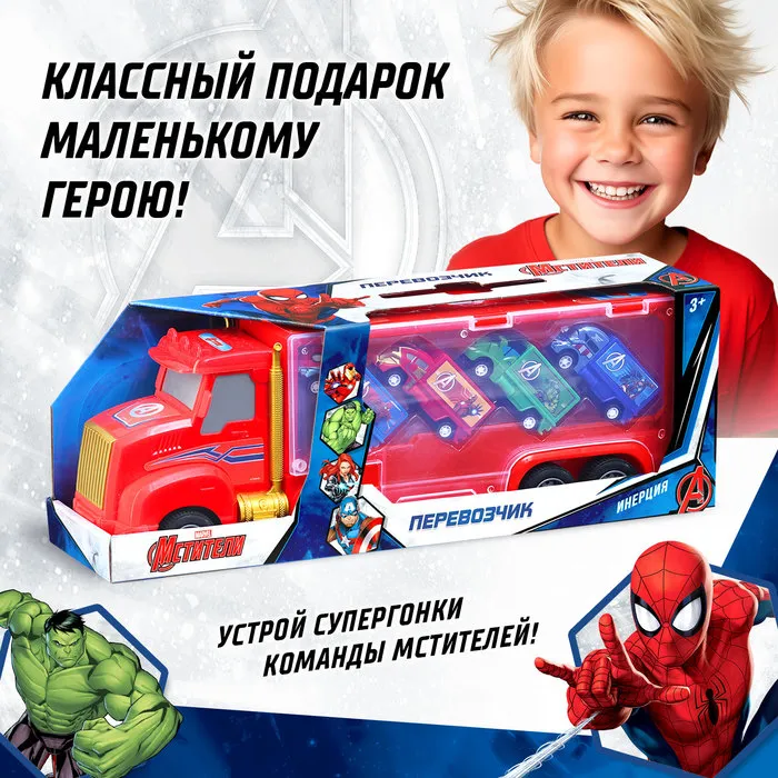 Грузовик-перевозчик «Мстители» – мощный автомобиль для перевозки супергеройских машин! Этот игровой набор позволит вашему ребенку разыгрывать захватывающие миссии по спасению мира вместе с любимыми персонажами Marvel.