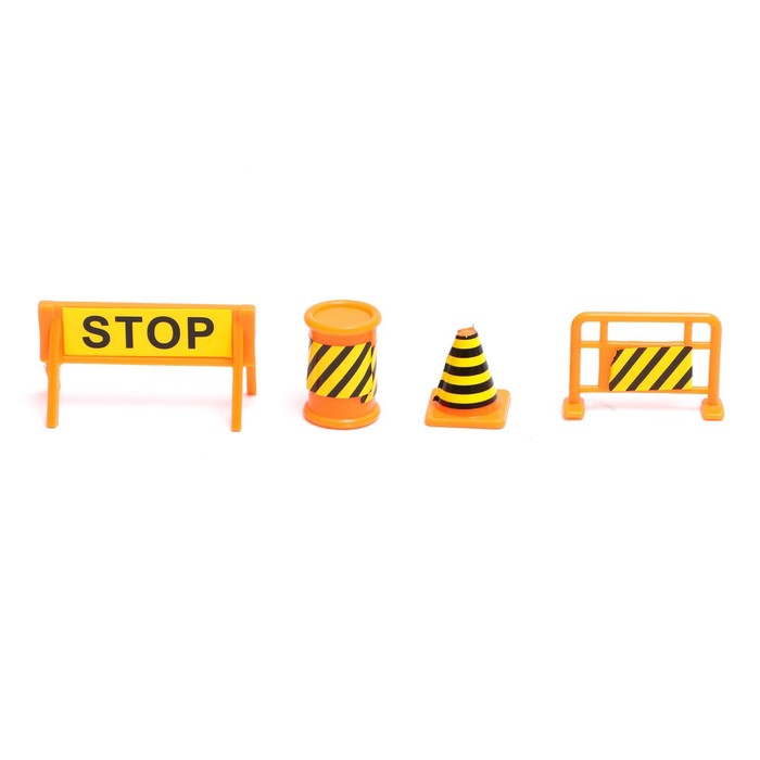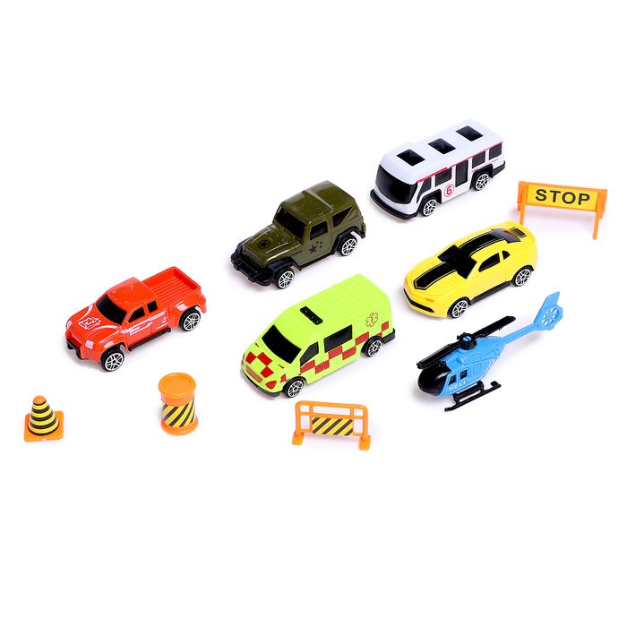 - В комплекте 5 разных машинок, 1 вертолёт и 4 дорожных знака.