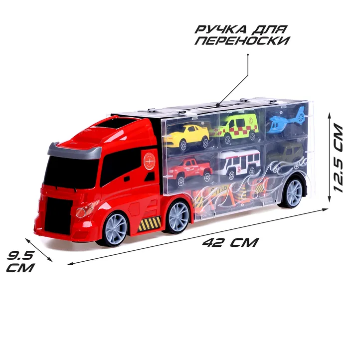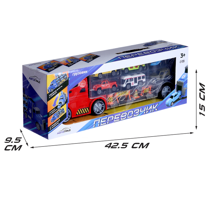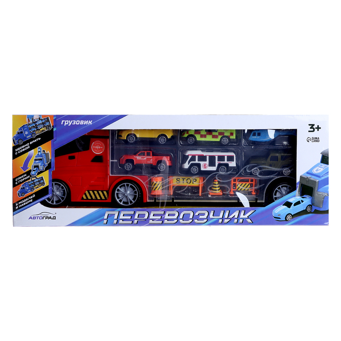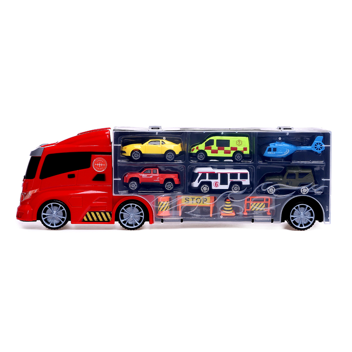 Грузовик «Перевозчик», в наборе 5 машинок, 1 вертолёт, 4 дорожных знака — Характеристики