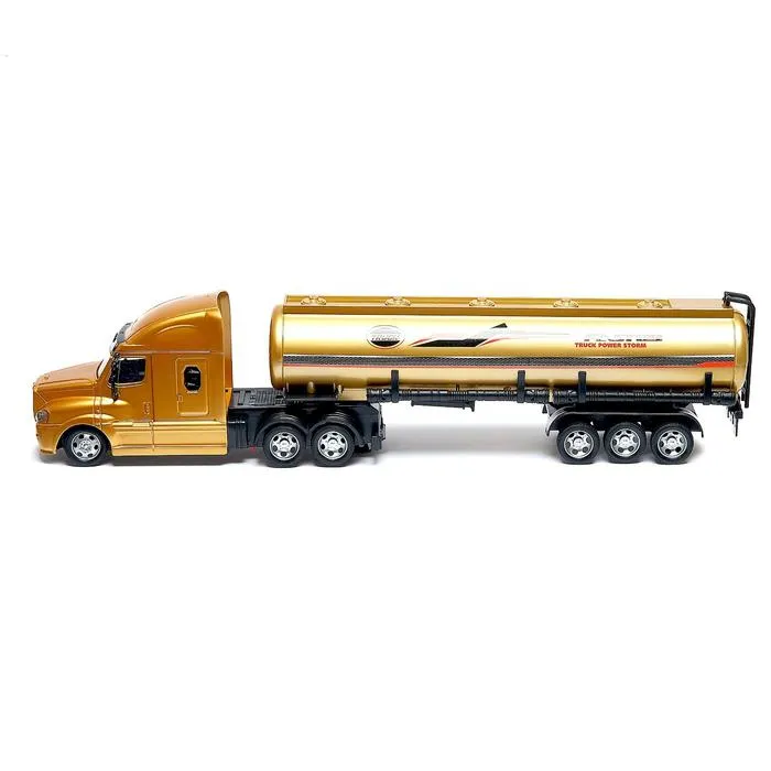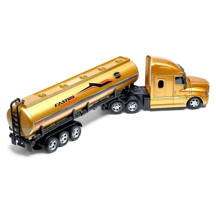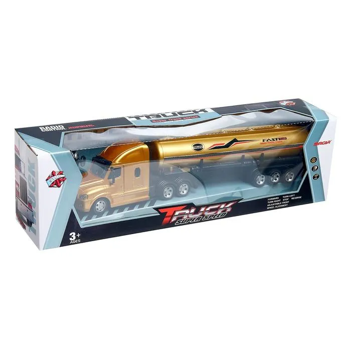 Радиоуправляемый бензовоз станет отличным подарком для ребёнка от 3 лет или поклонника техники. Модель выполнена в золотистом цвете и представляет собой грузовой автомобиль с цистерной, способный передвигаться во все стороны. Управление осуществляется при помощи пульта, а световые эффекты добавляют игре дополнительного драйва.