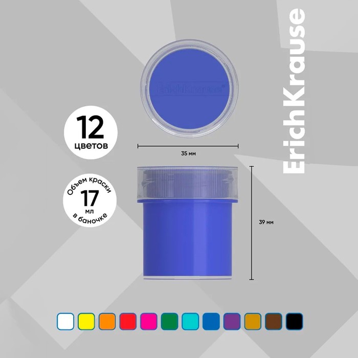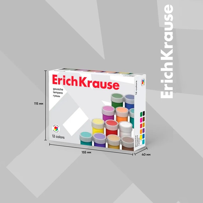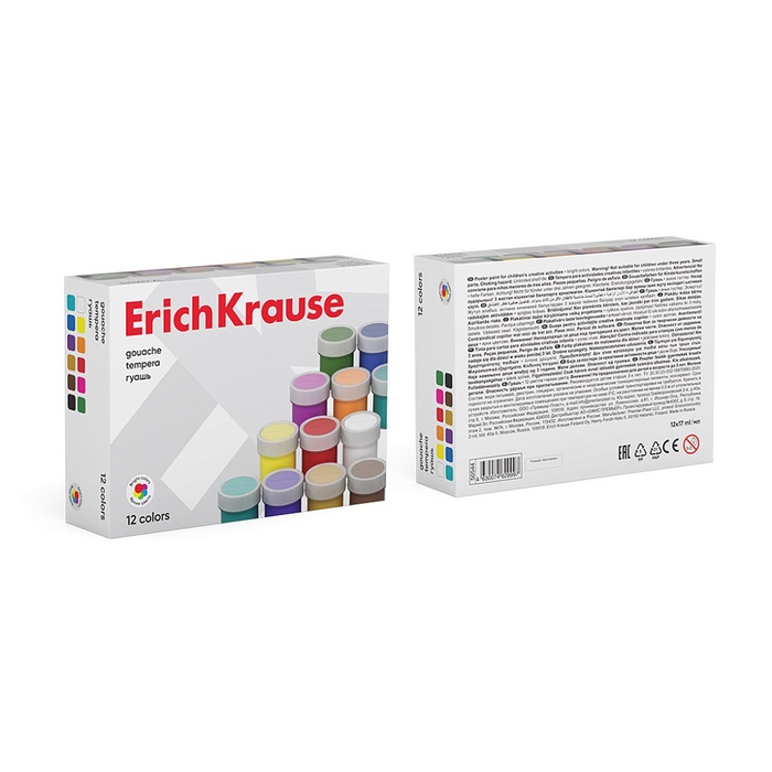 Гуашь ErichKrause®. Рисунки, выполненные такими красками, дольше сохраняют сочные цвета. Гуашь обладает насыщенными плотными цветами с высокой укрывистостью, при рисовании ровно ложится на бумагу и быстро высыхает, после высыхания рисунок приобретает матово-бархатистую поверхность.