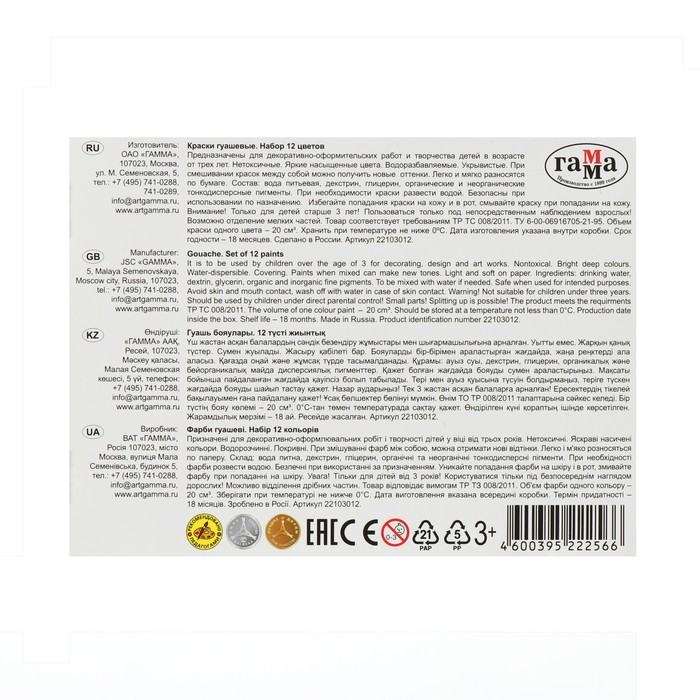 Гуашь 12 цветов × 20 мл «Гамма. Классическая» — Характеристики