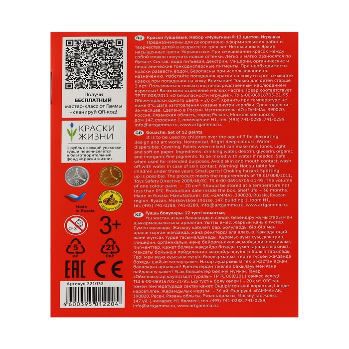 Гуашь 12 цветов × 20 мл «Гамма. Мультики», картонная упаковка поможет вашему ребёнку создавать красивые яркие картинки, выдумывать невероятные сюжеты и воплощать их в реальность, развивая цветовое восприятие, зрительную память, воображение, мелкую моторику пальцев, ассоциативное, аналитическое и творческое мышление.