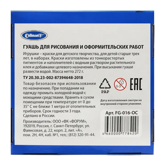 Гуашь 16 цветов х 10 мл, Cullinan "Океан", в картонной коробке — Характеристики