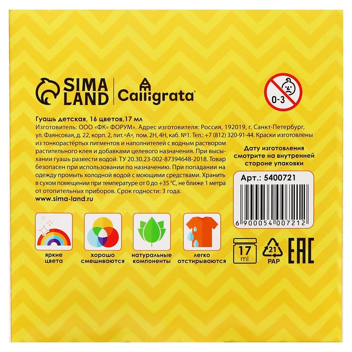 Гуашь 16 цветов × 17 мл Calligrata — Характеристики