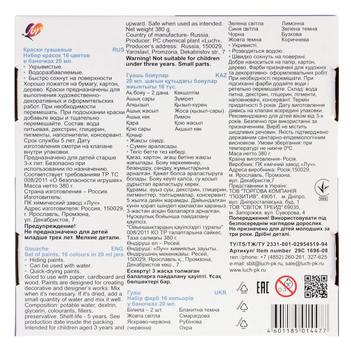 Гуашь для детского творчества, для выполнения художественно-декоративных и оформительских работ. Краски изготовлены на основе натуральных компонентов и высококачественных пигментов. На крышке имеется яркая этикетка с указанием цвета краски - удобство для покупателя, который сразу понимает, какой цвет ему нужен. Краске присущи яркие, красивые, чистые цвета, которые хорошо смешиваются, позволяя получать новые чистые цвета и оттенки. Гуашь имеет отличную укрывистость, при высыхании не выцветает, приобретает бархатистую поверхность. Гуашь легко смывается с рук и одежды и не имеет неприятного запаха. Безопасна для детского творчества, что подтверждено сертификатами (ЕАС).