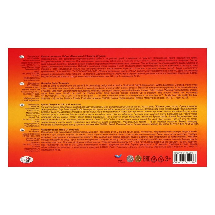 Гуашь 24 цвета × 20 мл «Гамма. Мультики» — Характеристики