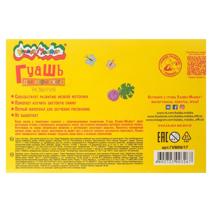 Гуашь серии "Каляка-Маляка" разработана совместно с педагогами специально для детей школьного возраста.
