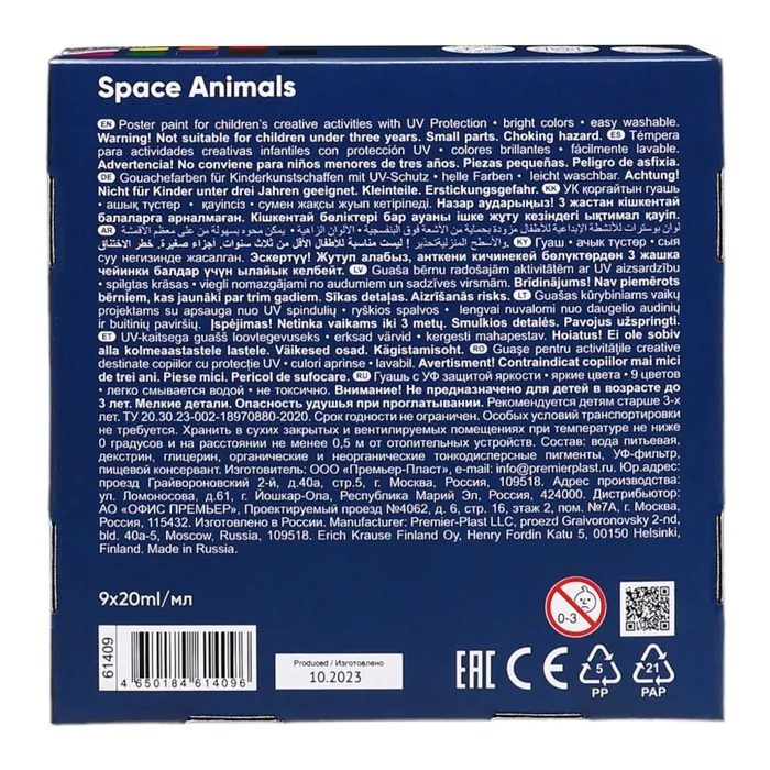 Гуашь 9 цветов × 20 мл ErichKrause Kids Space Animals, в картонной коробке — Характеристики