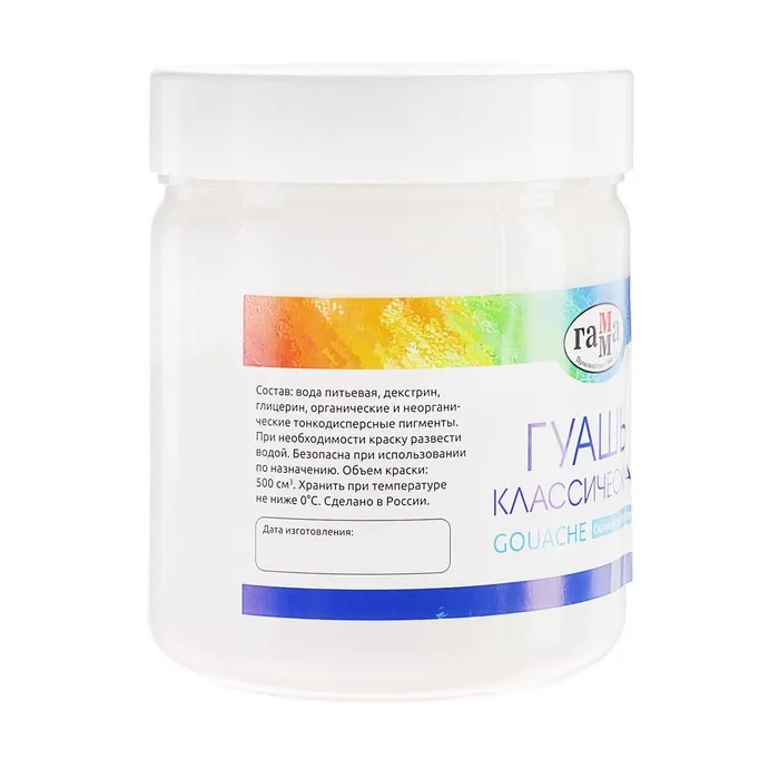Штучная гуашь объемом 500 мл серии "Классическая" предназначена для творческих занятий в школе и дома.