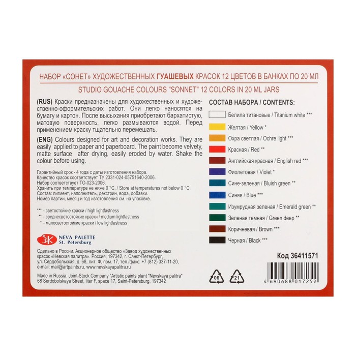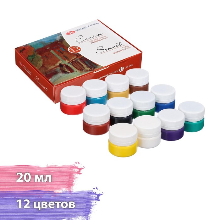 Гуашь художественная, набор 12 цветов х 20 мл, ЗХК "Сонет", (36411571) — Характеристики