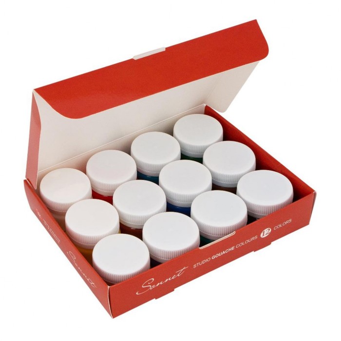 Палитра гуашевых красок в наборе "Сонет" состоит из 12 основных цветов, необходимых начинающему художнику для работы.