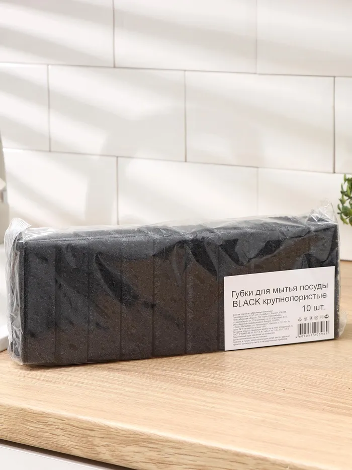 Чёрные поролоновые губки для посуды — это универсальное решение для эффективной уборки на кухне. Крупнопористая структура обеспечивает быстрое удаление загрязнений с любой поверхности, а поролоновая основа гарантирует долговечность и устойчивость к износу.