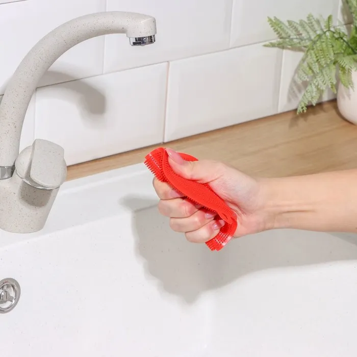 Многофункциональная губка из силикона подходит для очистки различных изделий: с ней легко мыть посуду, кухонные поверхности и даже овощи. Она тщательно удаляет загрязнения благодаря ворсу и тесному контакту с предметом.