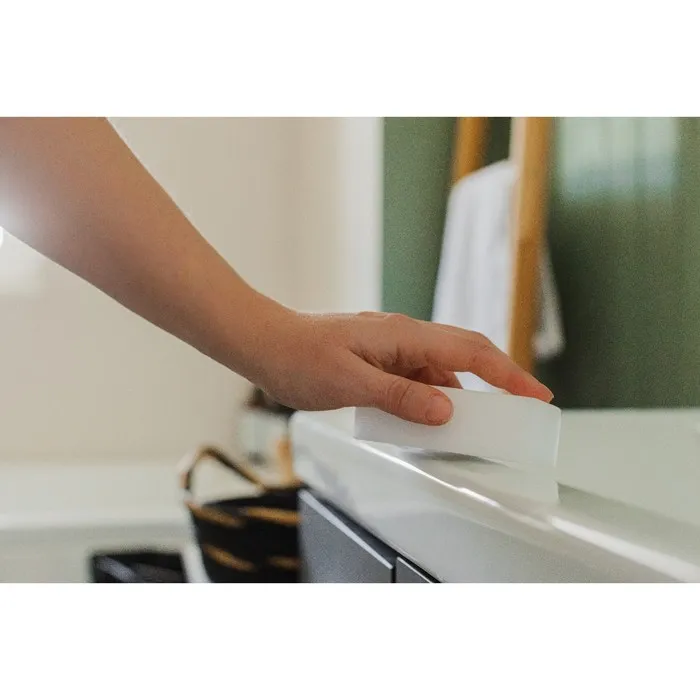 - Губка не имеет запаха и позволяет с легкостью очистить обувь (особенно эффективно на светлой подошве), сантехнику, пластиковые окна, керамическую плитку, бытовую технику и другие поверхности.