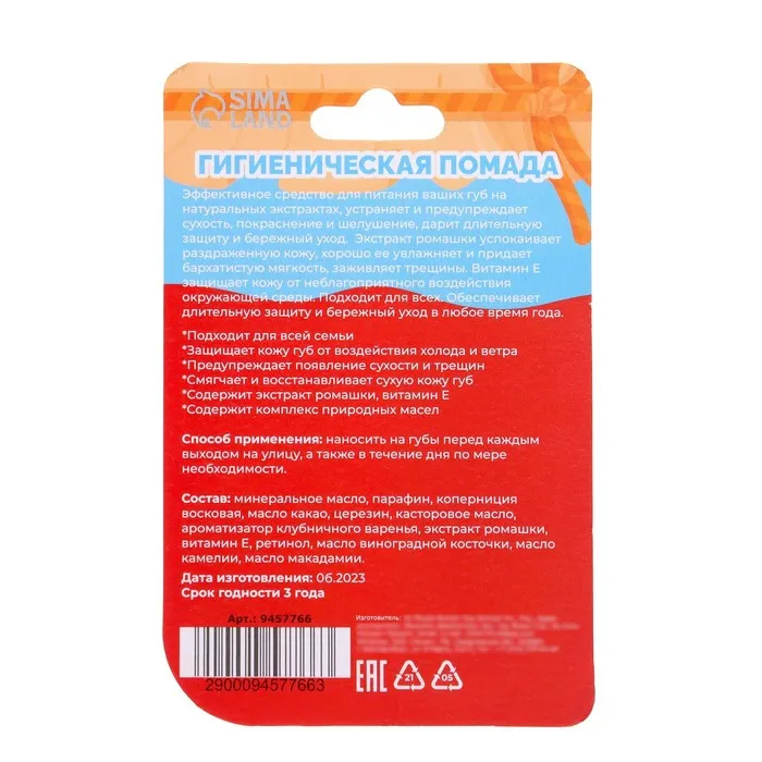 Состав: минеральное масло, парафин, коперниция восковая, масло какао, церезин, касторовое малос, ароматизатор клубничного варенья, экстракт ромашки, витамин Е, ретинол, масло виноградной косточки, масло камелии, масло макадамии.