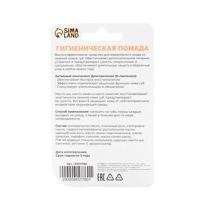 Состав: минеральное масло, пчелиный воск, касторовое масло, гидрогенезированное растительное масло, карнаубский воск, масло семян подсолнечника, масло камелии, парафин, ланолин, масло семян какао, ПЭГ-45 додецил гликоль сополимер, церезин, масло ши, пантенол, витамин Е, ароматизатор.