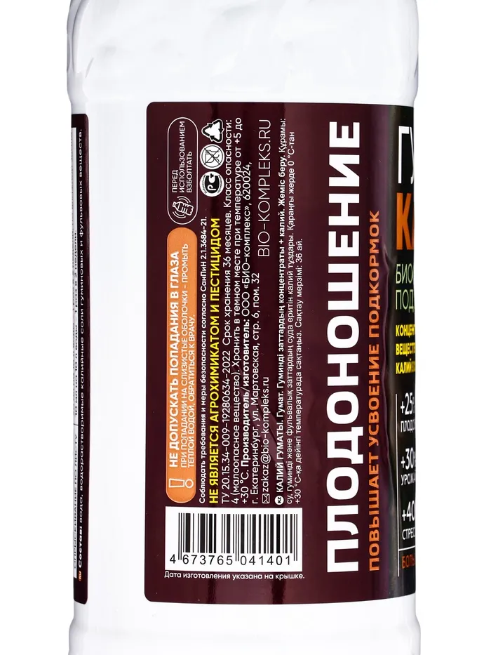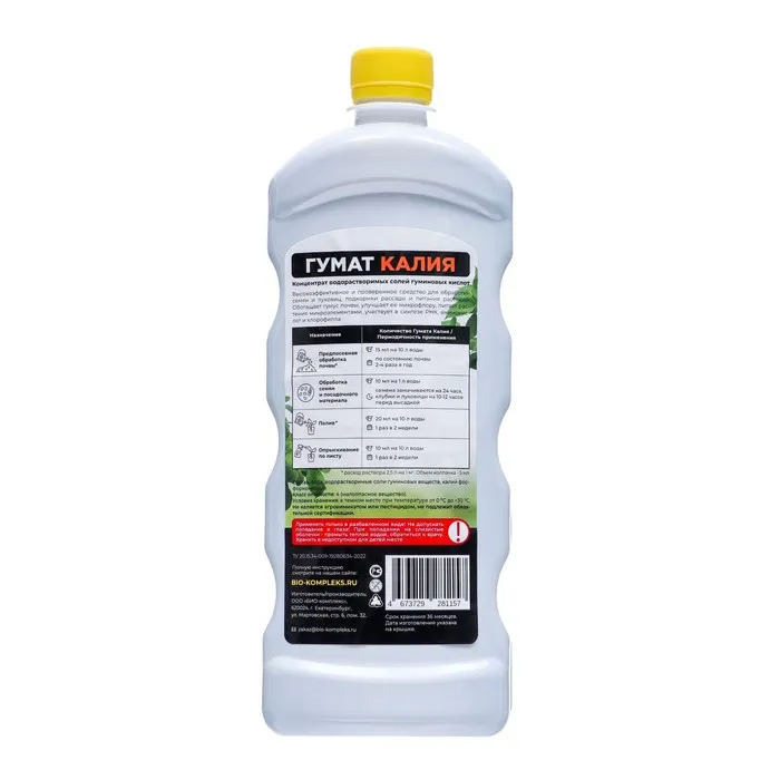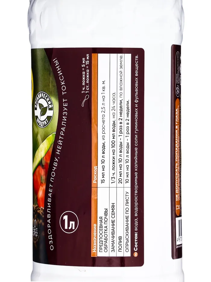 Состав: вода, водорастворимые соли гуминовых веществ, калий фос-форнокими. Класс опасности: 4 (неопасное вещество)