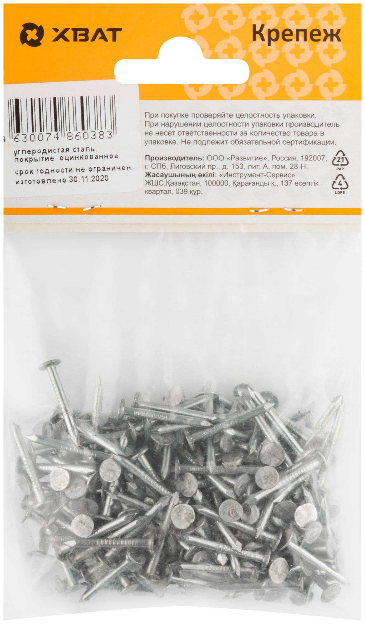 Гвозди изготовлены из прочной стали и имеют оцинкованное покрытие, что защищает их от коррозии и увеличивает срок службы. Каждая упаковка весом 120 грамм содержит достаточное количество гвоздей для выполнения небольших объемов работ.