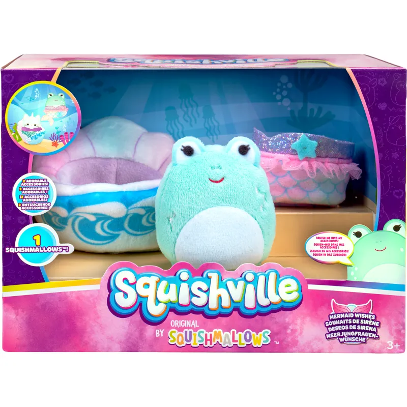 Набор Squishville Mermaid Wishes излучает подводное волшебство. Морская тематика набора включает одну маленькую фигурку Squishmallows (размер 5 см) и два тематических аксессуара. Идеальный подарок для маленьких любителей приключений!