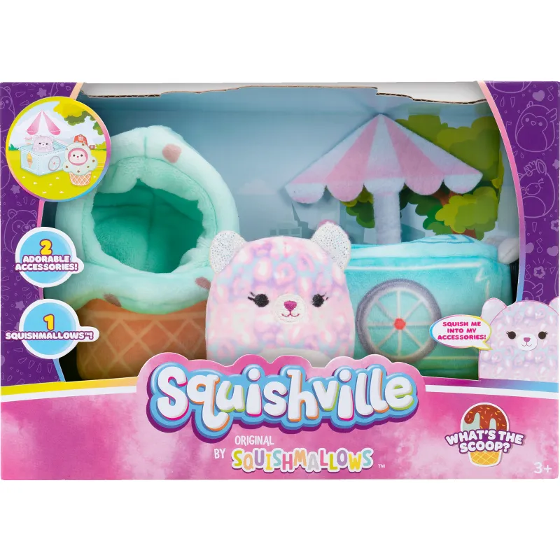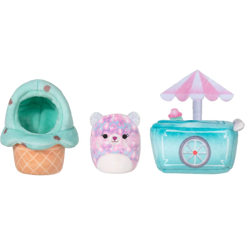 Летний набор Squishville What's the Scoop? включает в себя одного маленького персонажа Squishmallows (размер 5 см) и два тематических аксессуара. Этот набор идеально подходит для детей от 3 лет.