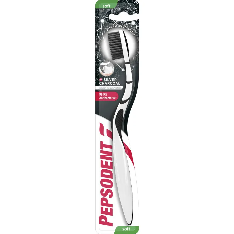 Зубная щетка Pepsodent Charcoal Soft оснащена черными щетинками, содержащими ионы серебра и уголь, которые активно предотвращают размножение бактерий в щетке. Мягкие щетинки обеспечивают бережный уход за полостью рта.