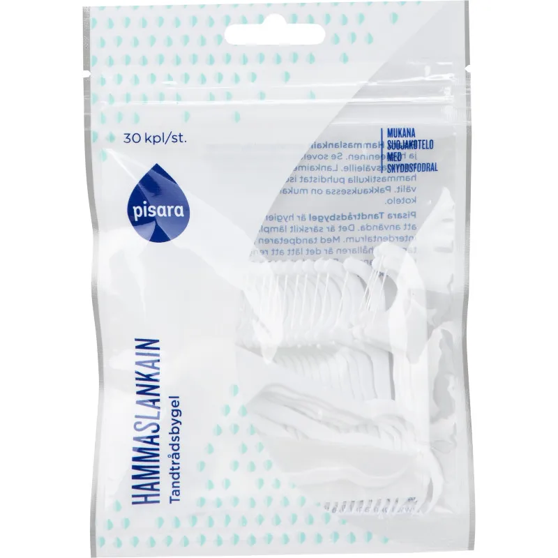 Helppokäyttöinen ja hygieeninen Pisara-hammaslankain sopii erityisesti ahtaille hammasväleille. Sen avulla saa helposti puhdistettua sieltä mihin hammasharja ei yllä. Lankaimen päässä olevalla hammastikulla voi puhdistaa isommat hammasvälit. Mukana kätevä suojakotelo. Pakkauskoko 30 kpl.