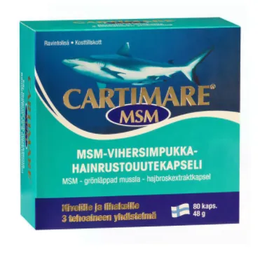Состав: метилсульфонилметан (МСМ), лиофилизированный порошок мидий (Perna canaliculus), экстракт акульего хряща, желатин , E 551, E 470b, краситель оболочки капсулы E 171.