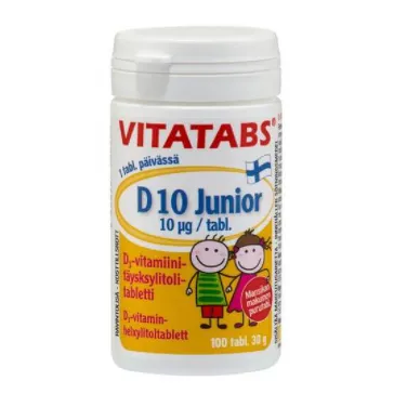 Vitatabs® D10 Junior. Витамин D 10 мкг для детей, 100 таблеток. Витамин D3 в форме жевательных пастилок из ксилита со вкусом клубники. Для укрепления иммунной системы, поддержания здоровья костей и зубов.