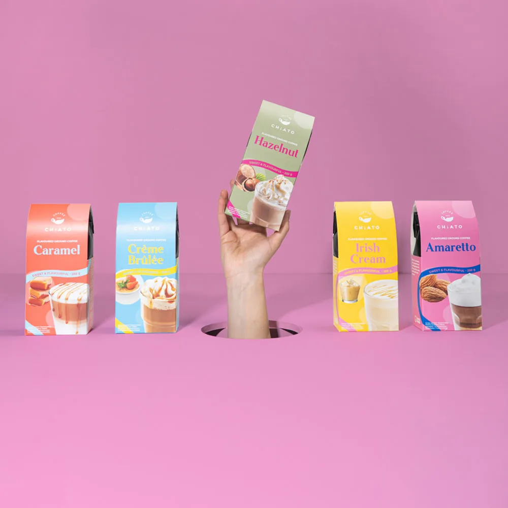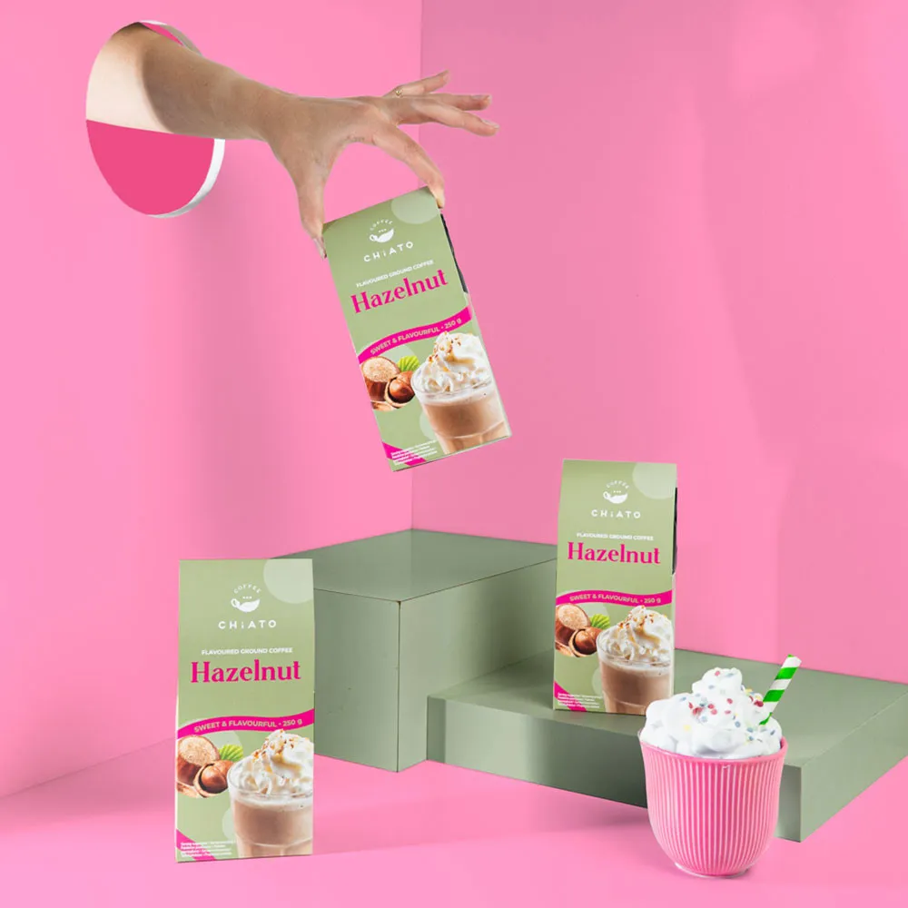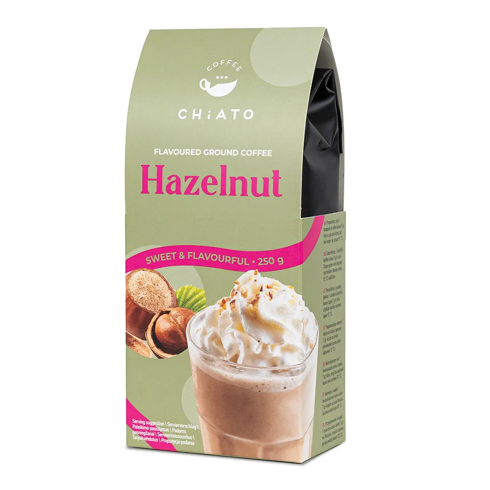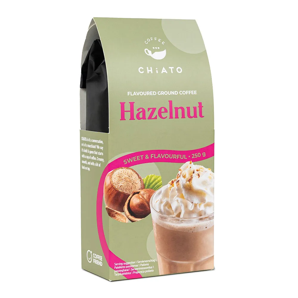 Наслаждайтесь насыщенным ароматом и вкусом молотого кофе CHiATO Hazelnut с нотками фундука, который идеален как для утреннего пробуждения, так и для вечернего расслабления.