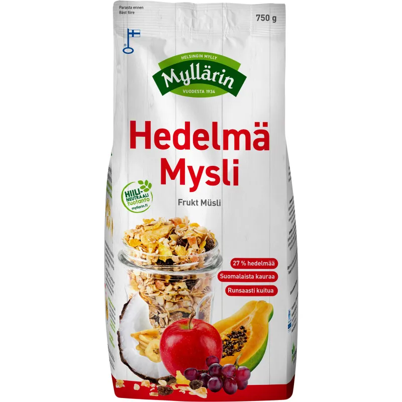 Myllärin фруктовый мюсли содержит богатый клетчаткой цельнозерновой овес, пшеничные хлопья и сушеные фрукты. Наслаждайтесь этим вкусным мюсли на завтрак или в качестве перекуса, а также добавляйте его в тесто для булочек. Упаковка 750 г.
