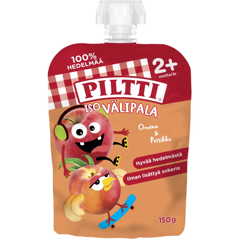 Piltti Iso Välipala Яблоко-Персик - это восхитительное сочетание яблока и персика. Пюре не содержит добавленного сахара или сладких соковых концентратов. Удобная упаковка позволяет брать его с собой в дорогу.