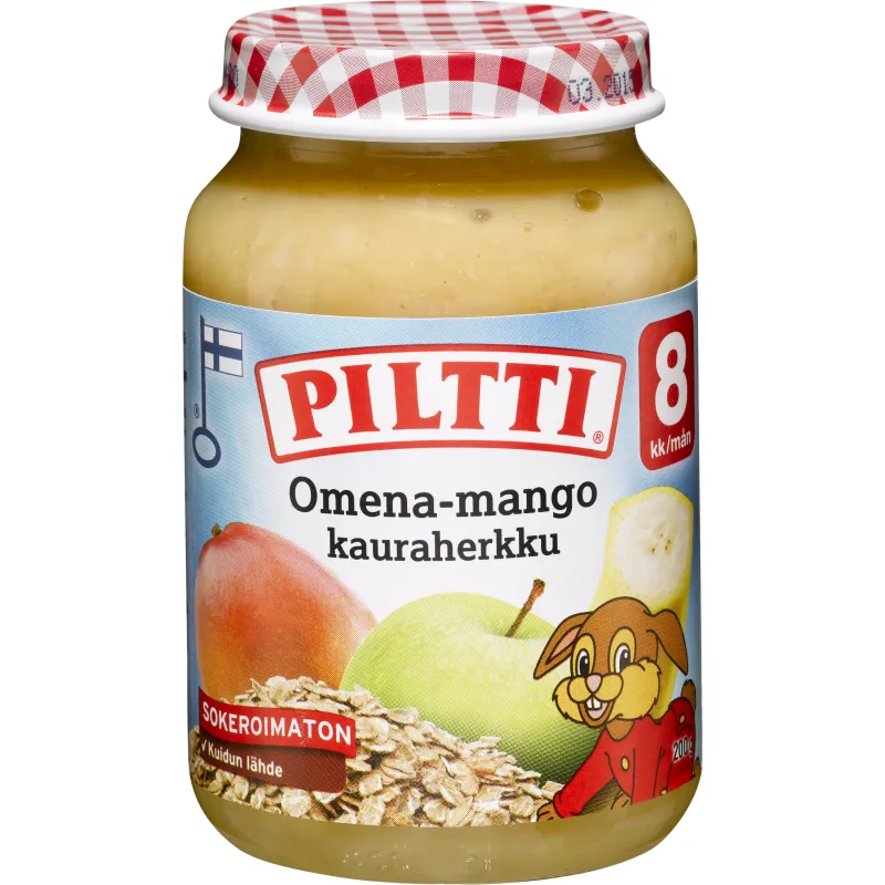 Piltti Овсяное лакомство с яблоком и манго — это сытное пюре для перекуса и десерта, в состав которого входят манго, банан, яблоко и овсяные хлопья. Несладкое пюре не содержит фруктовых соков с добавлением сахара. Произведено в Финляндии.