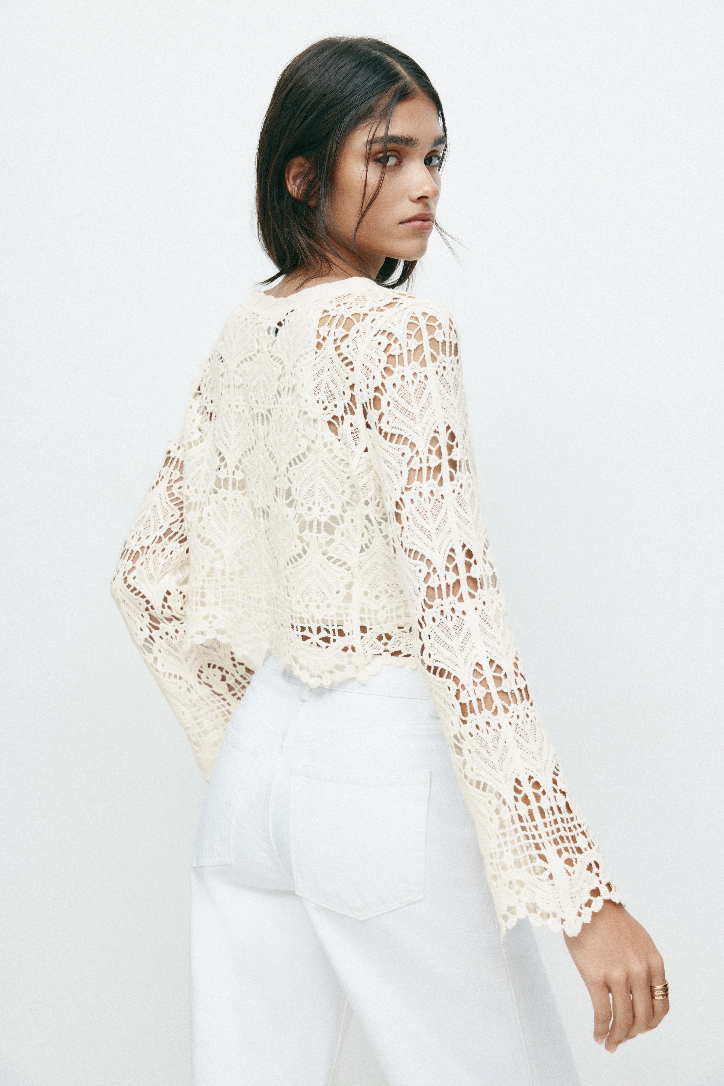 Короткая куртка с перцовой каймой из хлопкового трикотажа, напоминающего крючок. V-образный вырез и пуговица спереди. Длинные и свободные рукава. Ребристый край горловины и планка с пуговицами. Мы используем автоматический перевод в случае вопросов обращайтесь к менеджеру