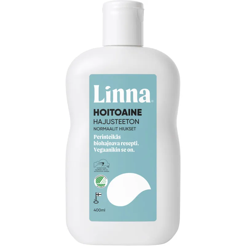 Бальзам Linna без запаха заботится о ваших волосах и коже головы. Подходит для всех типов волос. Сертифицированный знаком "Лебедь", биоразлагаемый и веганский продукт Linna – выбор ответственного потребителя. Дерматологически протестирован. Разработан в сотрудничестве с Союзом аллергии, кожи и астмы, подходит даже для чувствительной кожи. Все продукты Linna изготовлены в Финляндии и имеют знак "Ключевой флаг" как символ отечественного производства. Объем упаковки 400 мл.