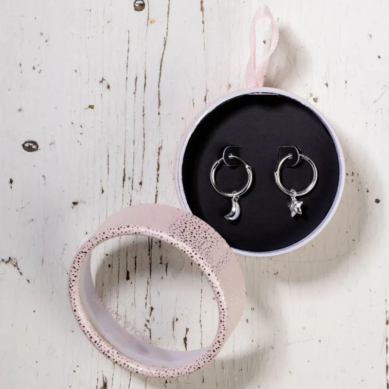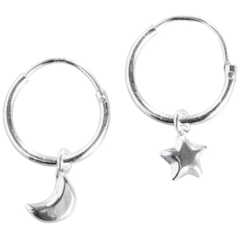 Эти серебряные серьги в форме колец с подвесками в виде луны и звезды украсят ваш образ и подчеркнут вашу индивидуальность. В комплекте одна пара серег.