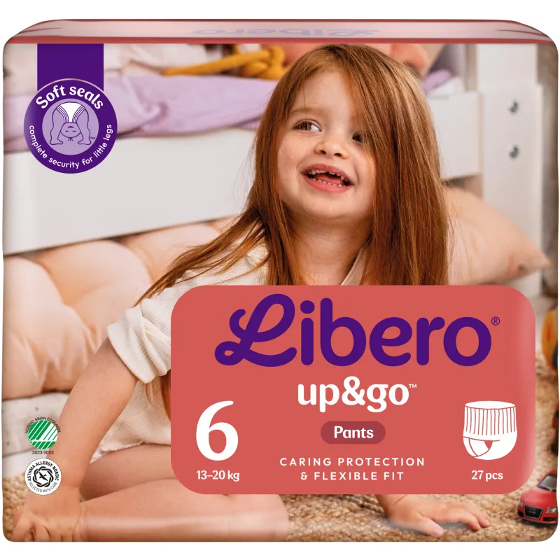 Libero Up&Go 6 - это трусики-подгузники, специально разработанные для детей весом от 13 до 20 кг. В упаковке 27 штук. Эти подгузники идеально подходят для активных малышей, обеспечивая мягкость, надежность и идеальную посадку. Эластичный пояс адаптируется к каждому движению ребенка, а мягкие манжеты обеспечивают отличную защиту вокруг ножек. Индикатор влаги подскажет, когда подгузник нужно менять.