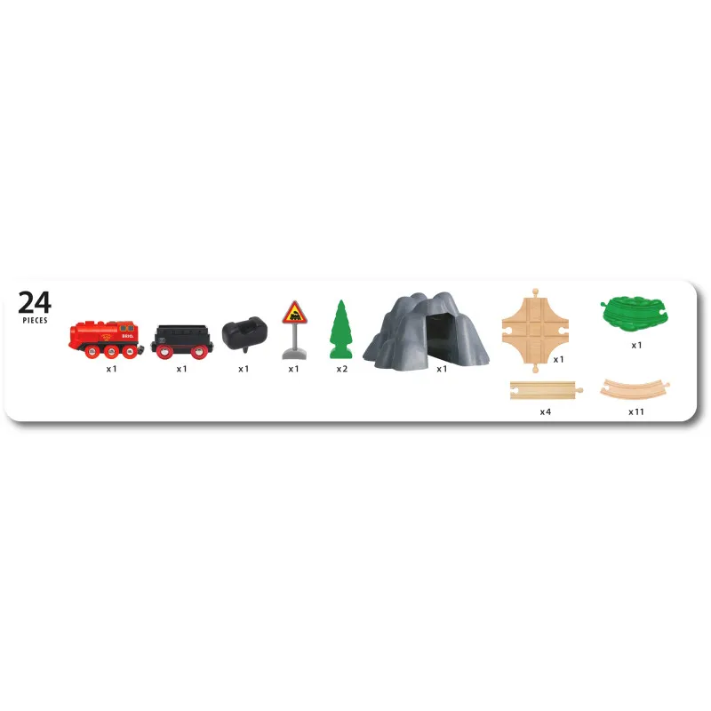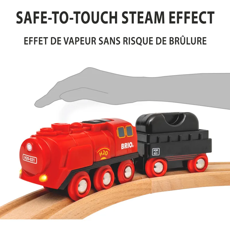 Набор паровозиков Brio 36017 привнесет в игру атмосферу реалистичности благодаря своим паровым эффектам. Паровозик, движущийся по восьмиобразной трассе, работает от батареек и производит пар, который безопасен для прикосновения. Если вода заканчивается, вы легко можете наполнить паровозик из специального резервуара, который он перевозит. Нажав на красную кнопку на паровозике, активируется передний свет и паровозик начинает производить пар вновь.