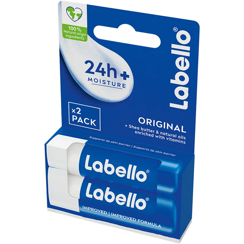 Увлажняющий бальзам для губ Labello Original помогает защитить губы от холода, ветра и сухого воздуха. Натуральная формула содержит ухаживающее масло ши и натуральные масла. Бальзам для губ Labello Original не содержит минеральных масел. Дерматологически протестирован. Упаковка 2 x 4,8 г. Мы постоянно обновляем информацию о продукте. Однако, всегда рекомендуется проверять информацию на упаковке.