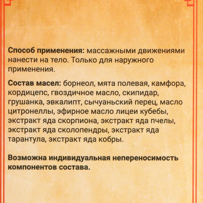 Состав: борнеол, мята полевая, камфора, кордицепс, гвоздичное масло, скипидар, грушанка, эвкалипт, сычуаньский перец, масло цитронеллы, эфирное масло лицеи кубебы, экстракт яда скорпиона.