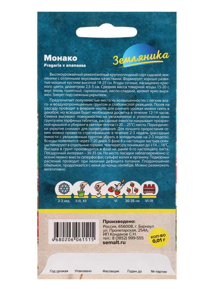 Ягода Земляника Монако ремонтантная крупноплодная/Сем Алт/цп 0,01 гр. НОВИНКА — Характеристики